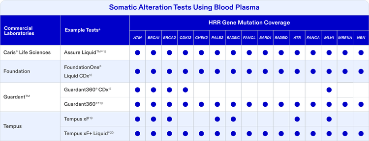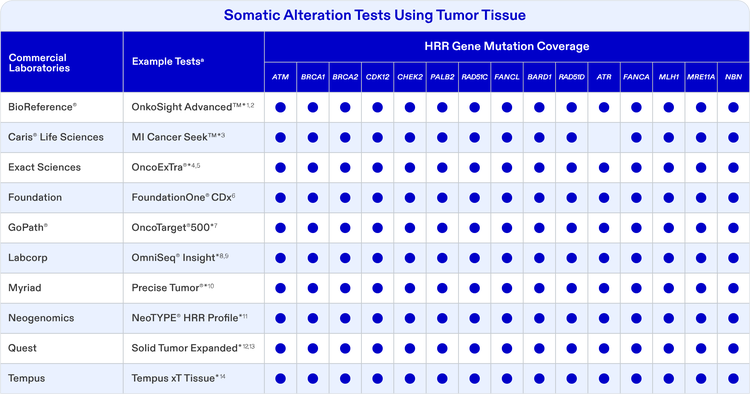 Explore currently available testing options to decide which is most appropriate based on sample type and HRR alteration coverage.* Bookmark and refer back to this page. This page will be updated periodically as new information on tests becomes available.