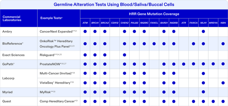 The diagnostic tests listed are generally commercially available HRR alteration gene panels. List is current as of July 2025. Tests listed may include analysis of genes outside of HRR pathways.